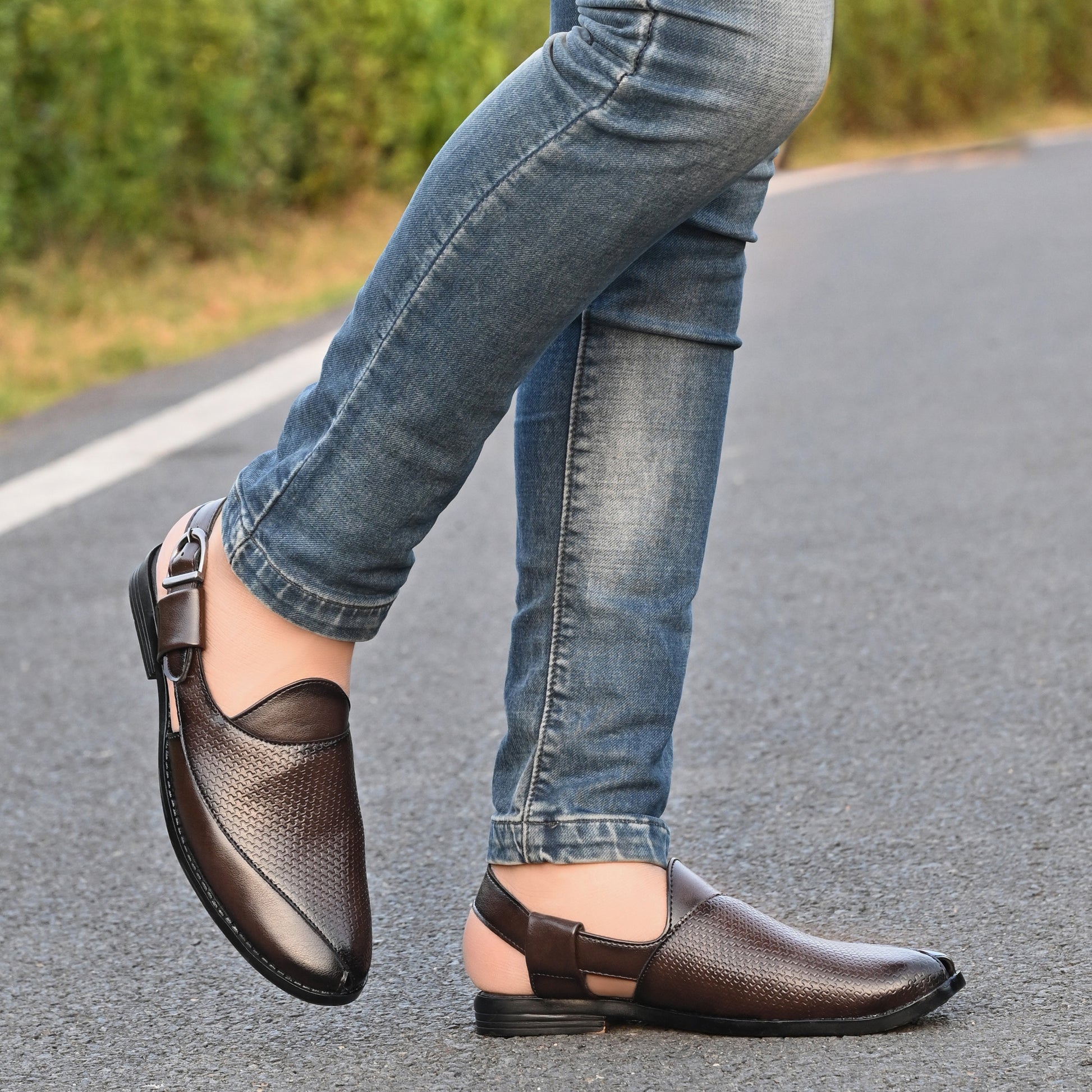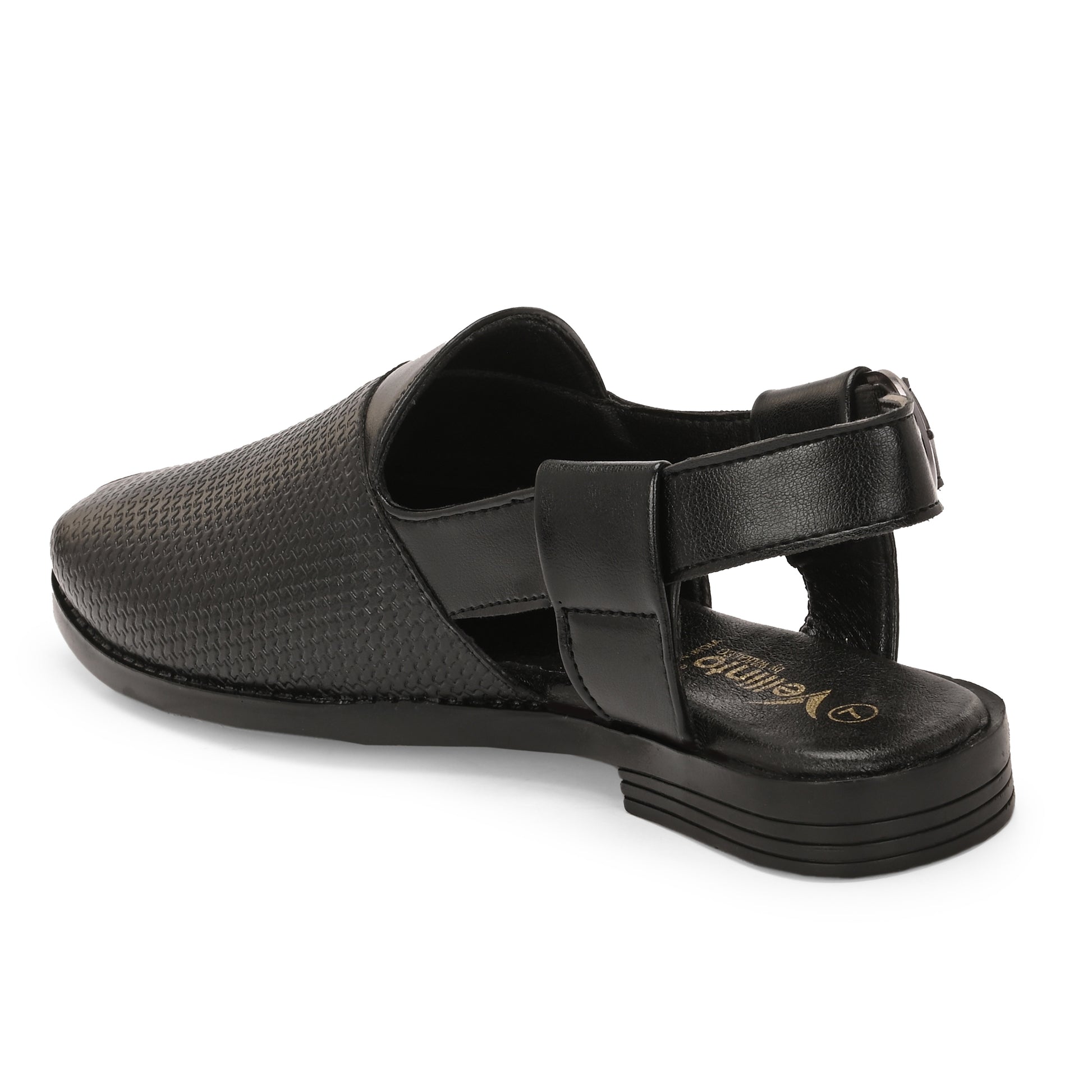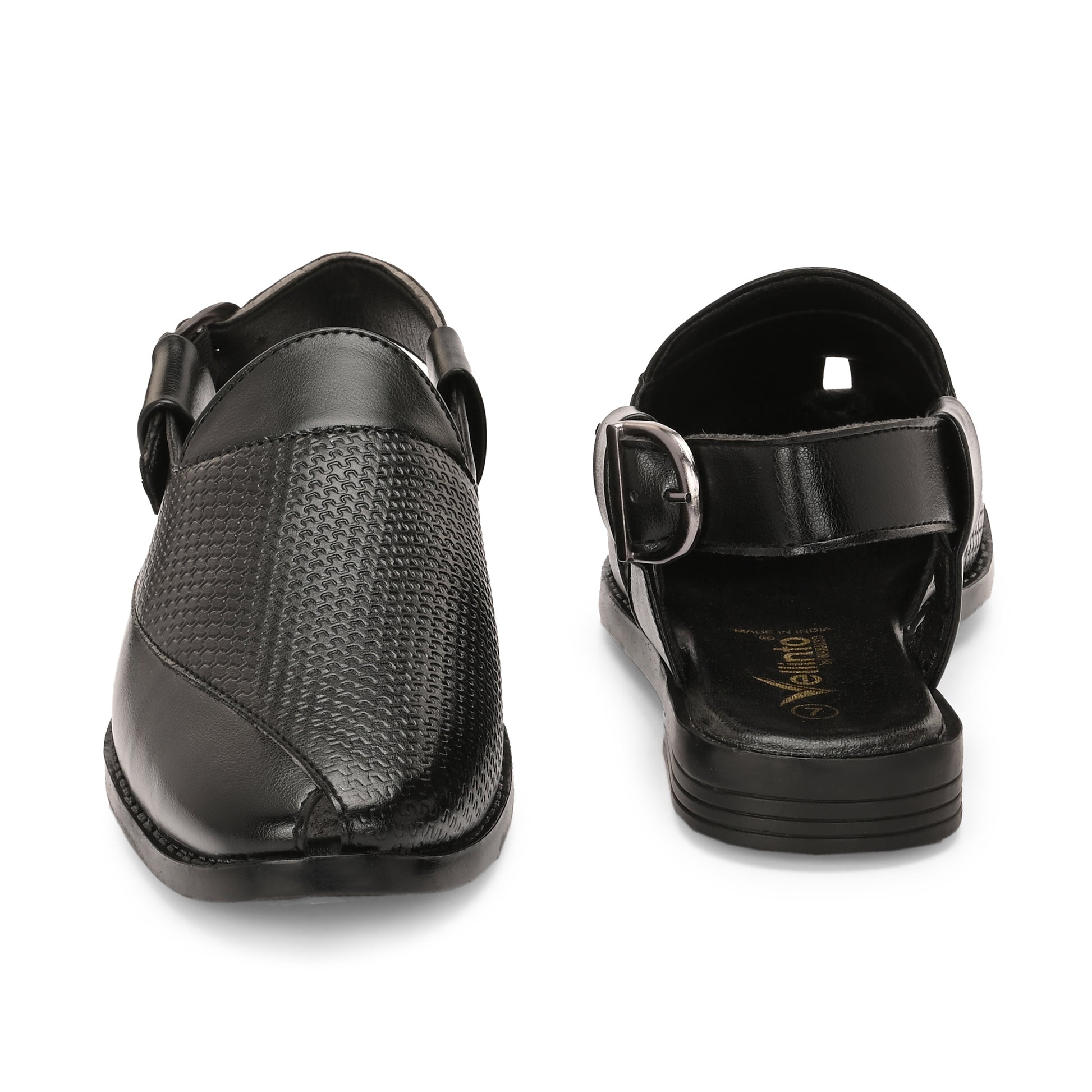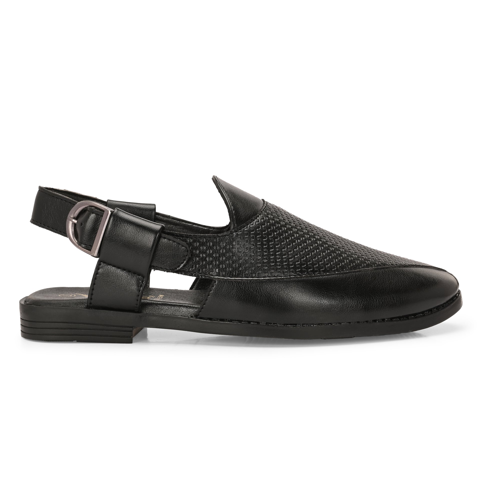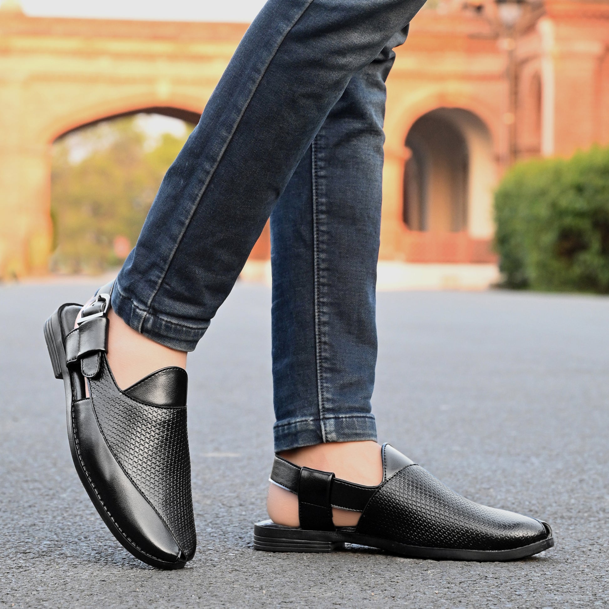 These black synthetic leather Peshawari sandals, with their textured upper and open-back design, are the epitome of style and comfort. Whether you're dressing up for a special event or keeping it casual, these shoes will elevate your look and provide unmatched comfort throughout the day. Don't miss out on adding this versatile and durable pair to your collection!