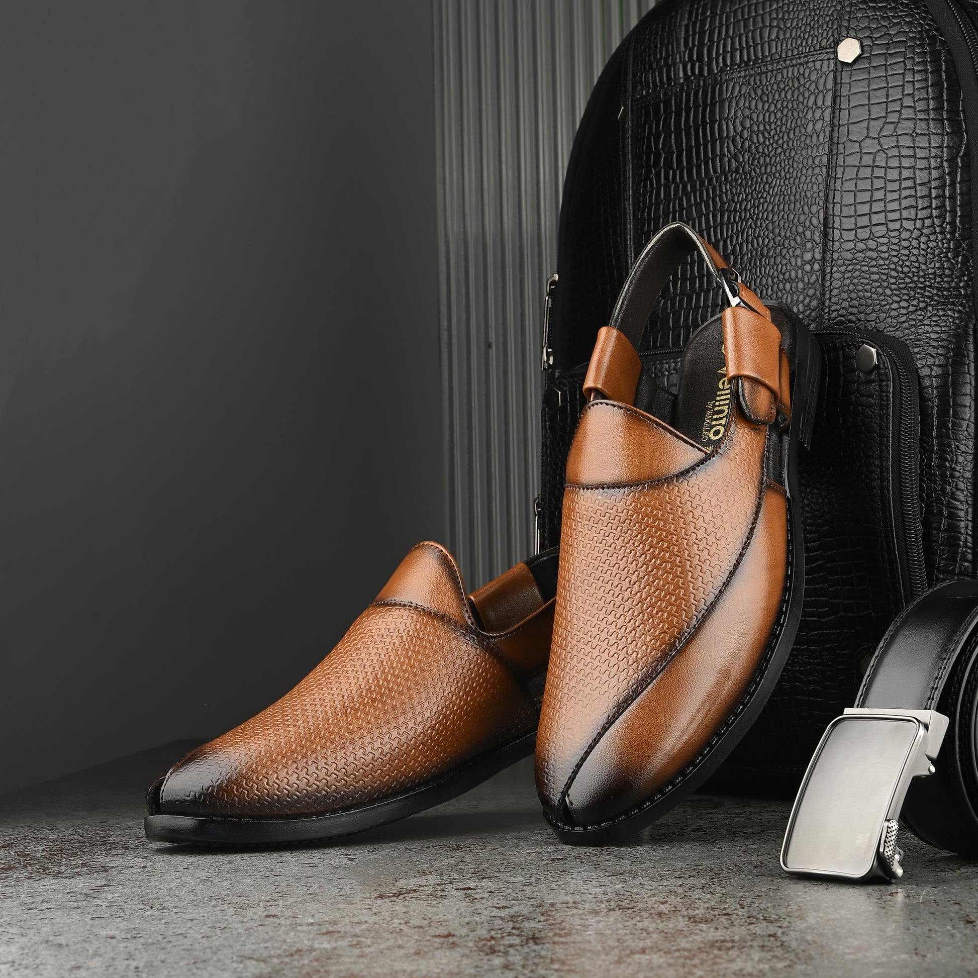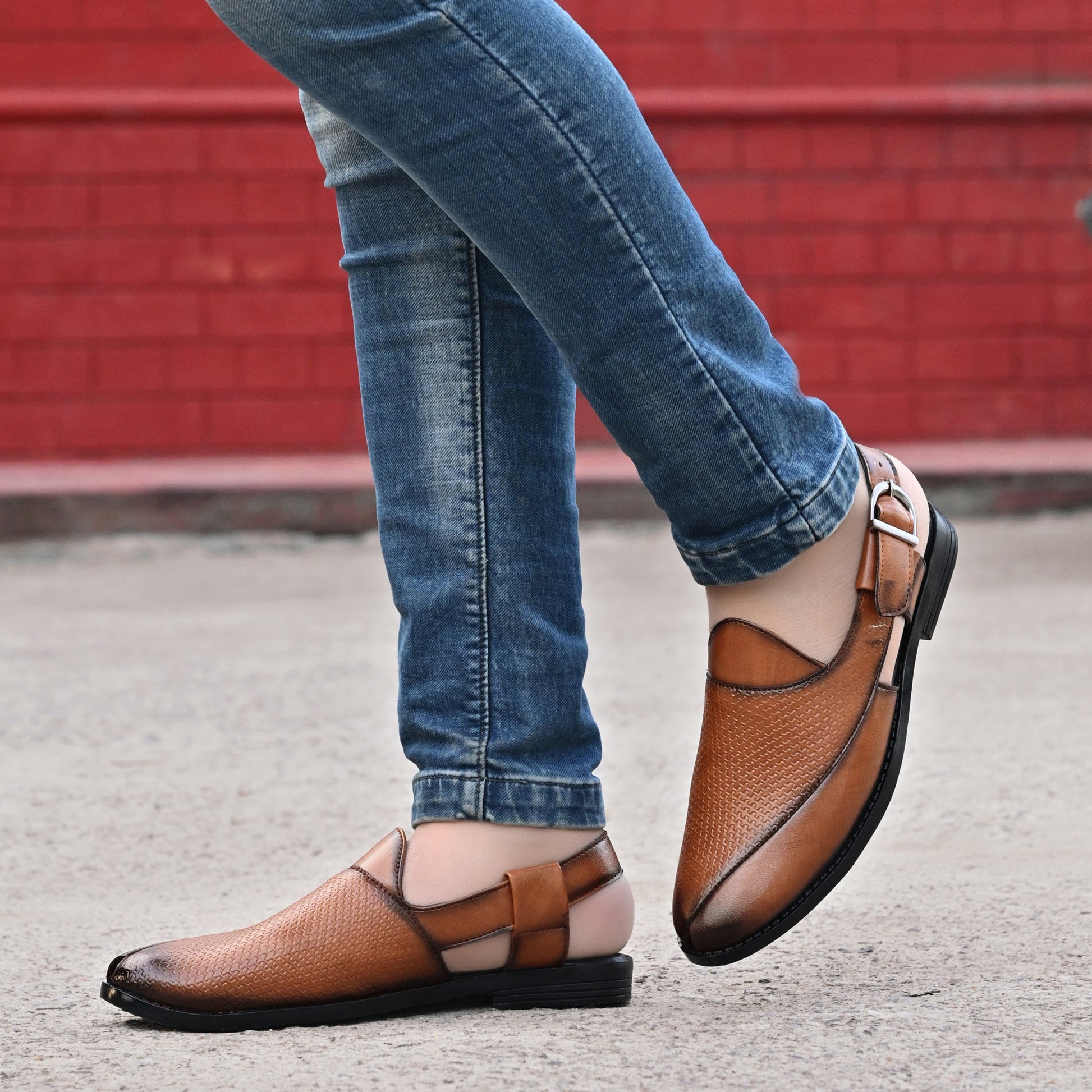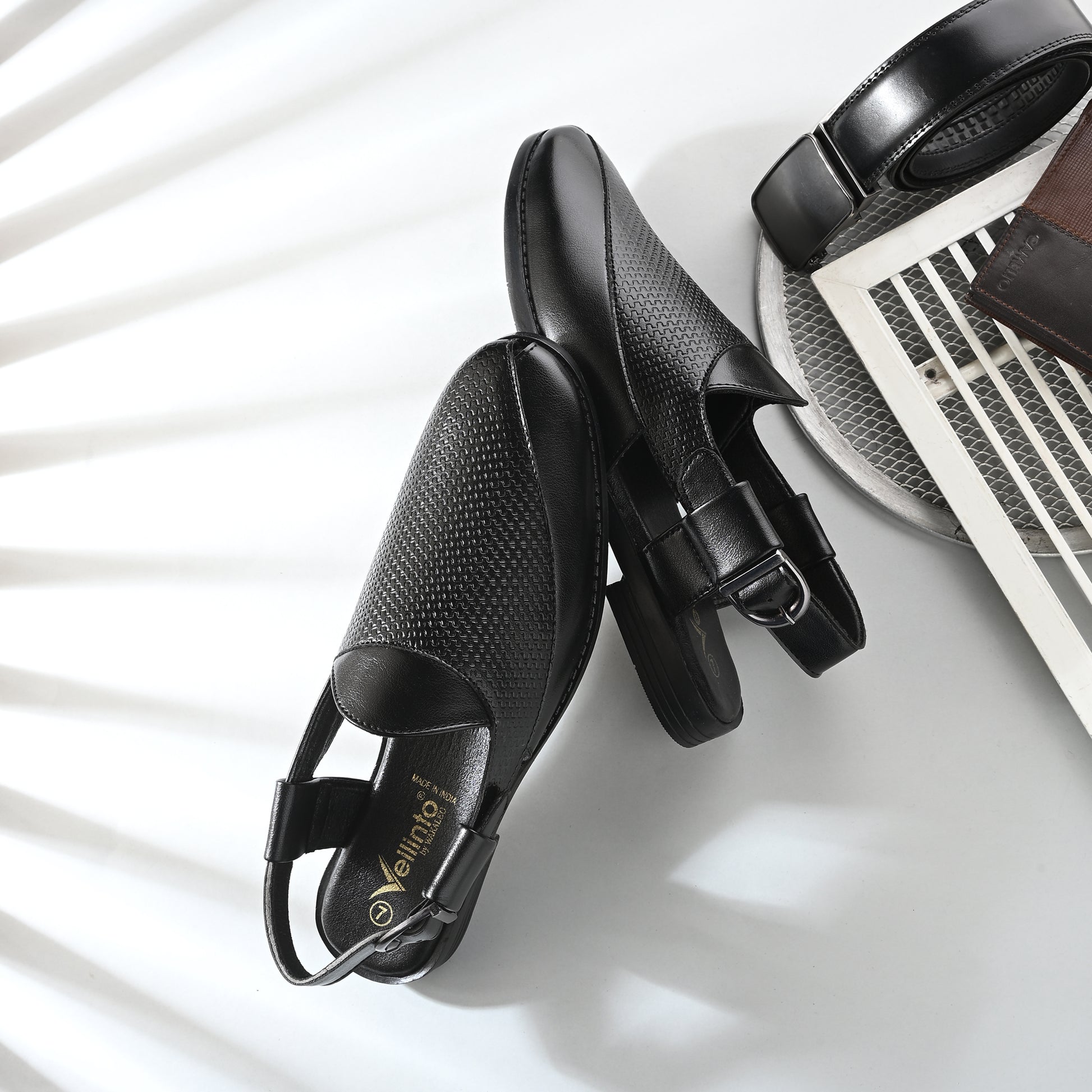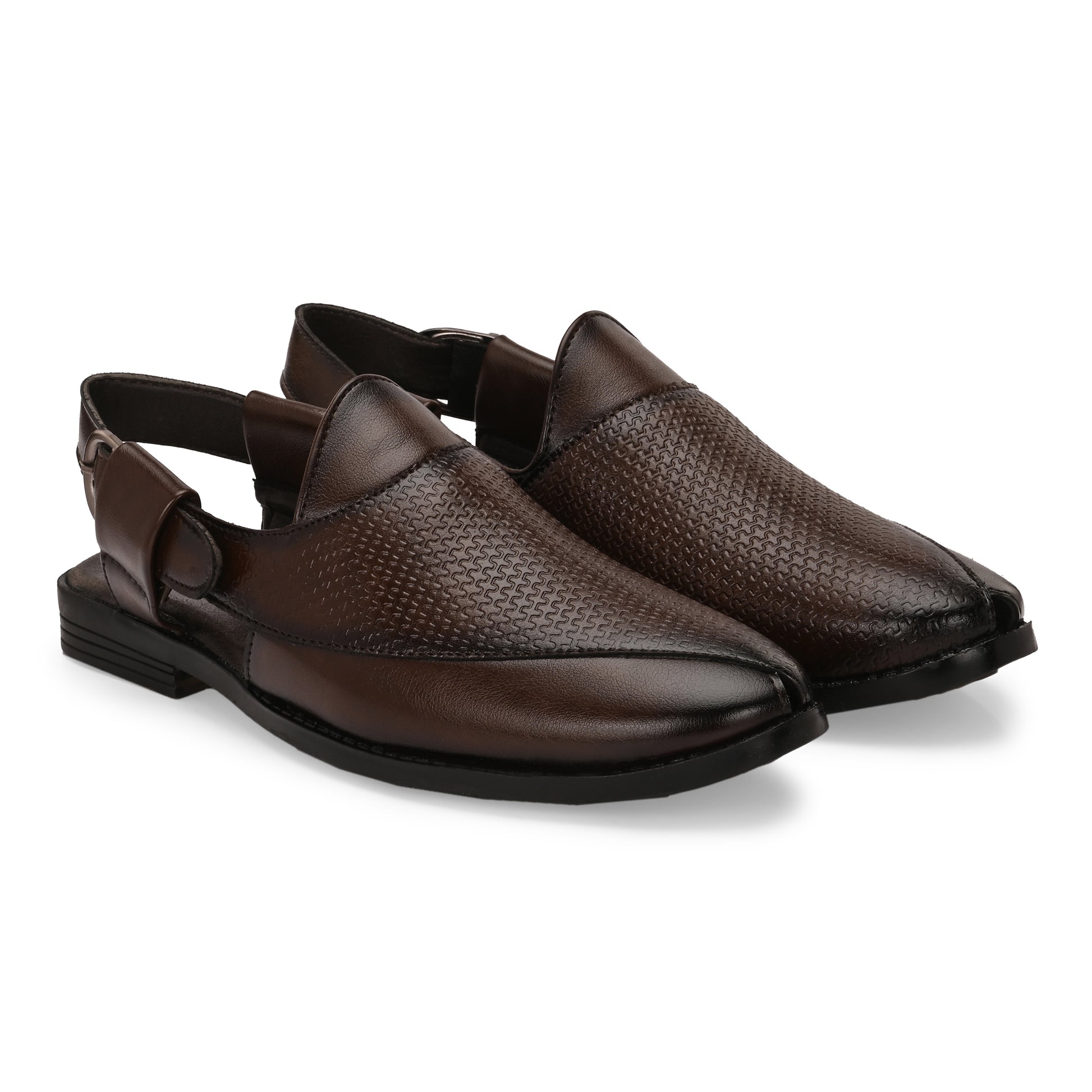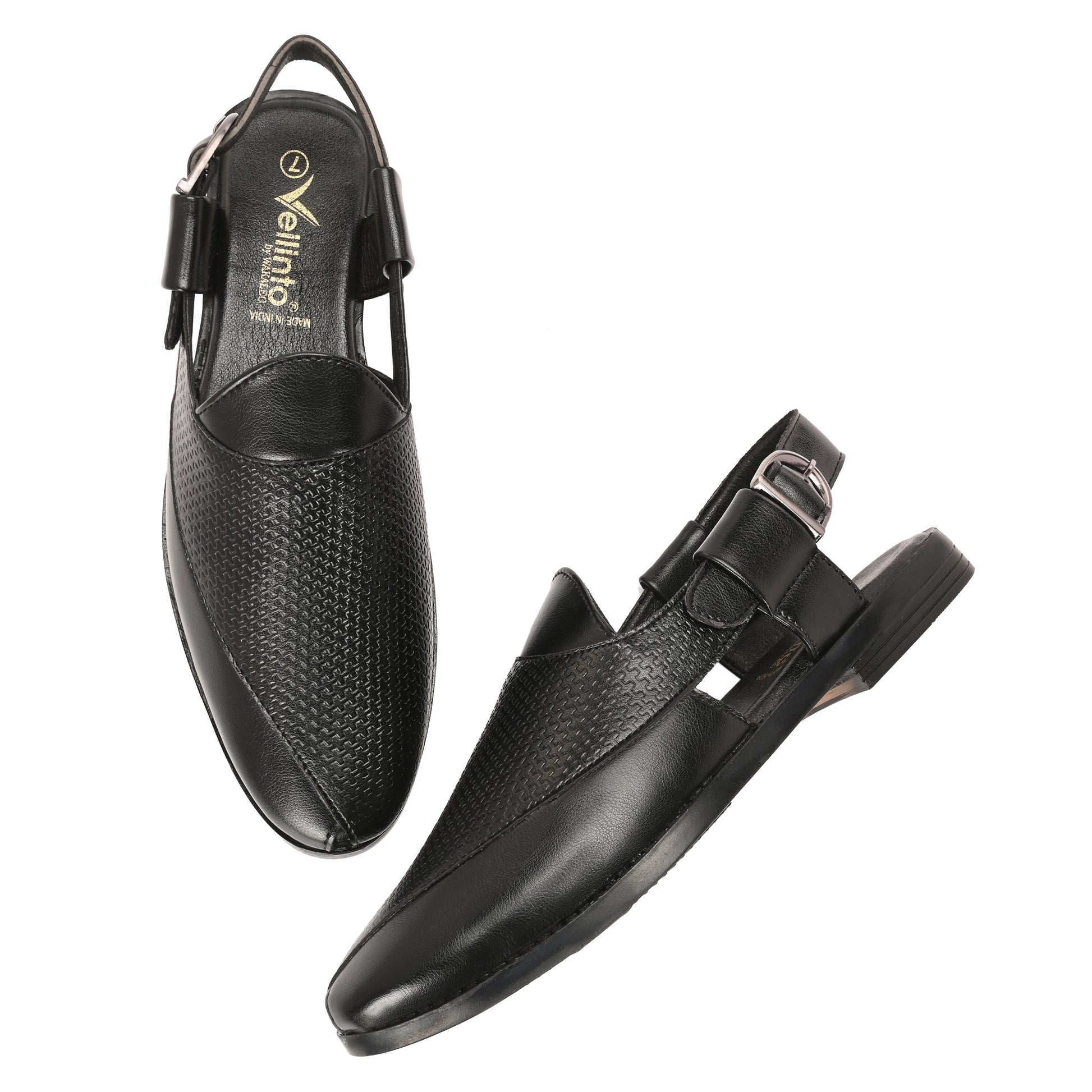 These black synthetic leather Peshawari sandals, with their textured upper and open-back design, are the epitome of style and comfort. Whether you're dressing up for a special event or keeping it casual, these shoes will elevate your look and provide unmatched comfort throughout the day. Don't miss out on adding this versatile and durable pair to your collection!