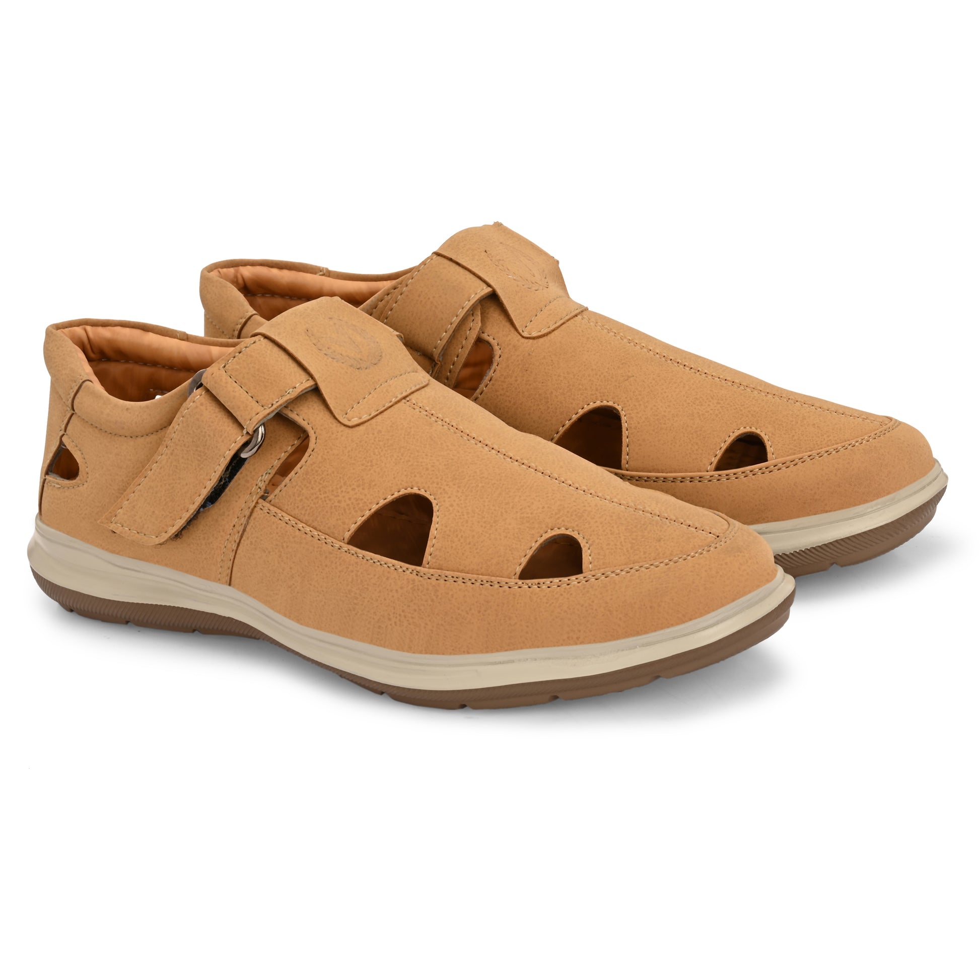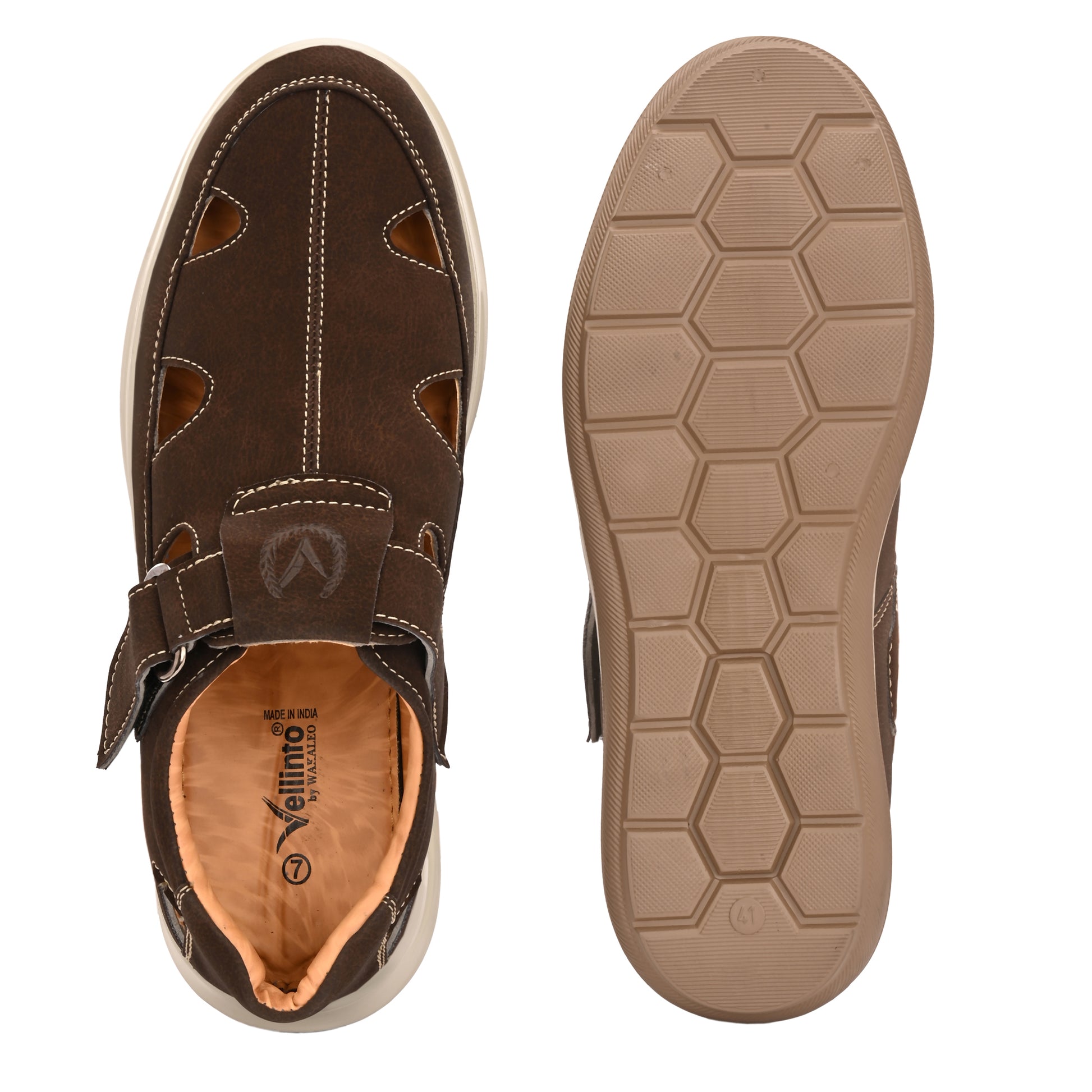 Vellinto Introducing our premium Vellinto FLEXORA sandals that blend ethnic charm with modern sophistication. Crafted for all-day comfort, they feature a soft inner lining and breathable cutout detailing for superior airflow. The dual-strap system with Velcro and buckle ensures a secure, adjustable fit. Built with a durable, anti-skid airmix sole, these sandals offer excellent grip and long-lasting performance. Lightweight yet sturdy, they’re perfect for daily wear or special occasions. The embossed signature logo adds a refined touch. Designed for the Indian lifestyle and terrain, these sandals effortlessly complement both traditional and casual outfits—making them a must-have in every modern wardrobe. casual sandal for men are made up of high quality synthetic material stays strong and durable - meaning the shoes will last much longer. Lifestyle: formal/ business. Pair these stylish Vellinto shoes with your shirt & trousers for that perfect look. Office wear, office shoes, formal shoes, Slip-on, business shoes. Closure: slip-on. Vellinto shoes are hand-crafted for that perfect fit. Perforated insole lets air pass through the material. This is great for leather shoes because the material lets air in to cool your feet and stop them from smelling. Fit: comfort fit. Vellinto endorses style that strikes a fine balance between the classic and the modern, the discreet and the bold with good taste being the only criterion for selection.