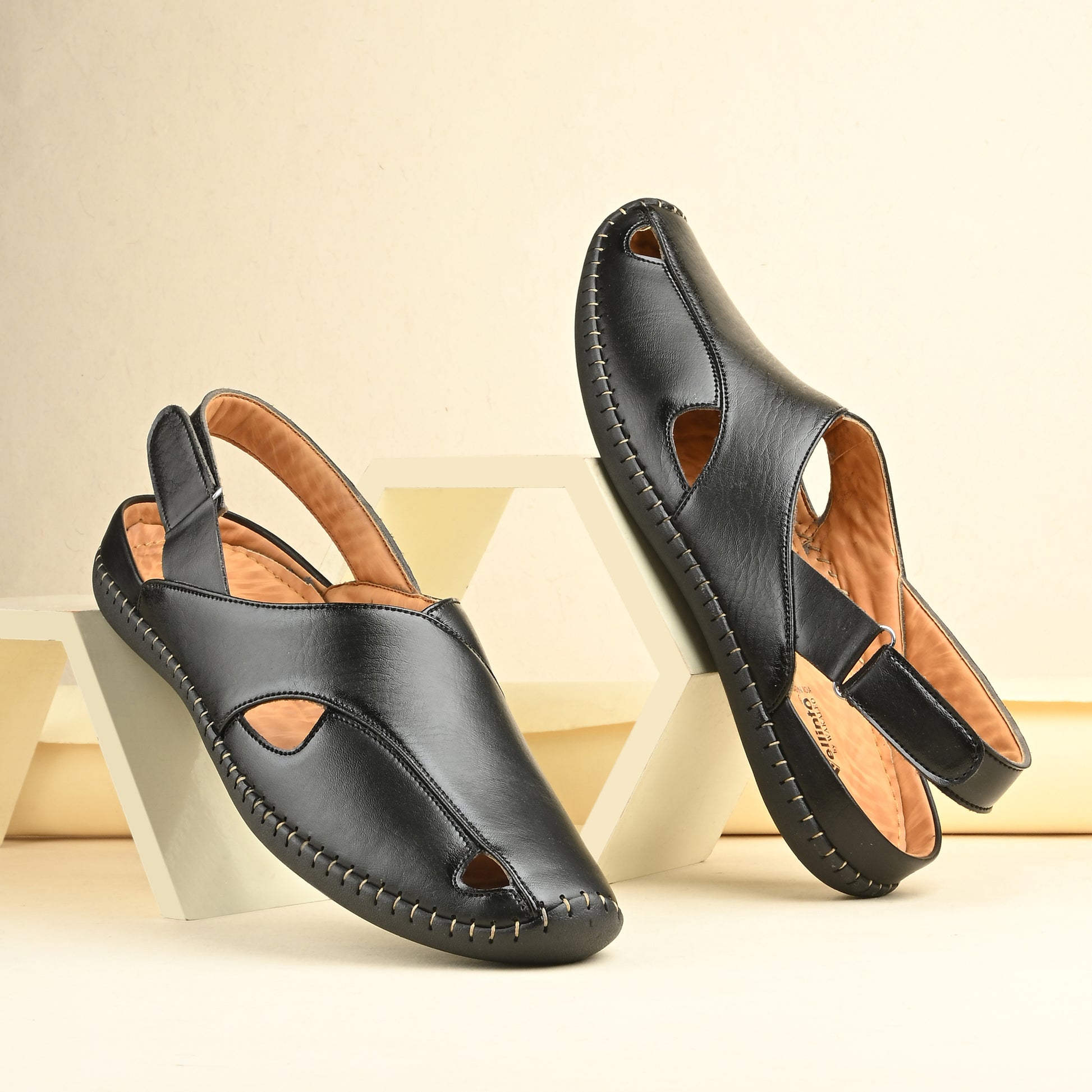 Step into cultural elegance with our hand-woven synthetic leather ethnic sandals for men, featuring a stylish back strap for added comfort and support. Crafted by skilled artisans, each pair showcases intricate weaving patterns that evoke traditional charm with a modern twist. The synthetic leather construction offers the look and feel of genuine leather while being environmentally conscious. These sandals boast a durable sole for enhanced traction, making them ideal for both casual outings and special occasions. Experience the perfect blend of style, comfort, and craftsmanship with these versatile and timeless ethnic sandals.
